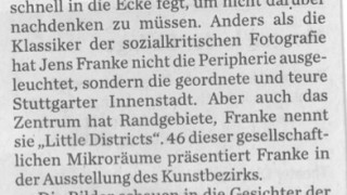 Am 30. Mai öffnet im Outer Rim (Bebelstr.70) die Ausstellung Jens Franke – Straßenfotografien aus Stuttgart. Einige Arbeiten werden hier zum ersten Mal gezeigt. "Meine erste Serie von Straßenfotografien aus Stuttgart habe ich unter dem Titel “Little Districts” zusammengefasst. …